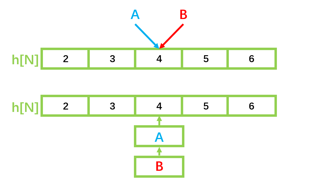 int h[N],e[N],ne[N]; //h[N]存储映射,初始化为-1 e[N]存储原值 ne[N]存储下一个结点的指针