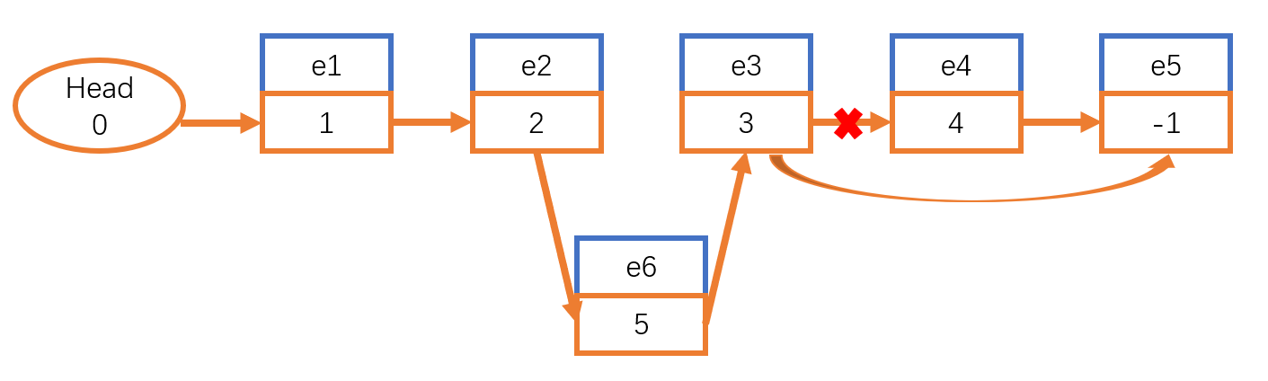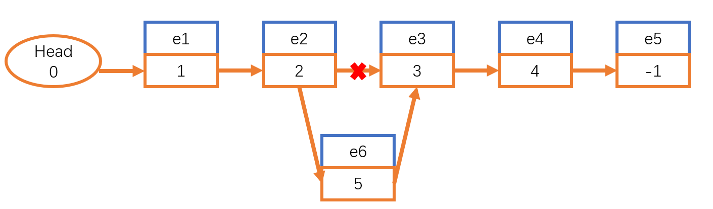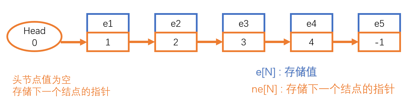 int e[N],ne[N],head=-1,idx=0; //e[N]存储值,ne[N]存储下一个结点,初始化head头结点,idx充当指针作用