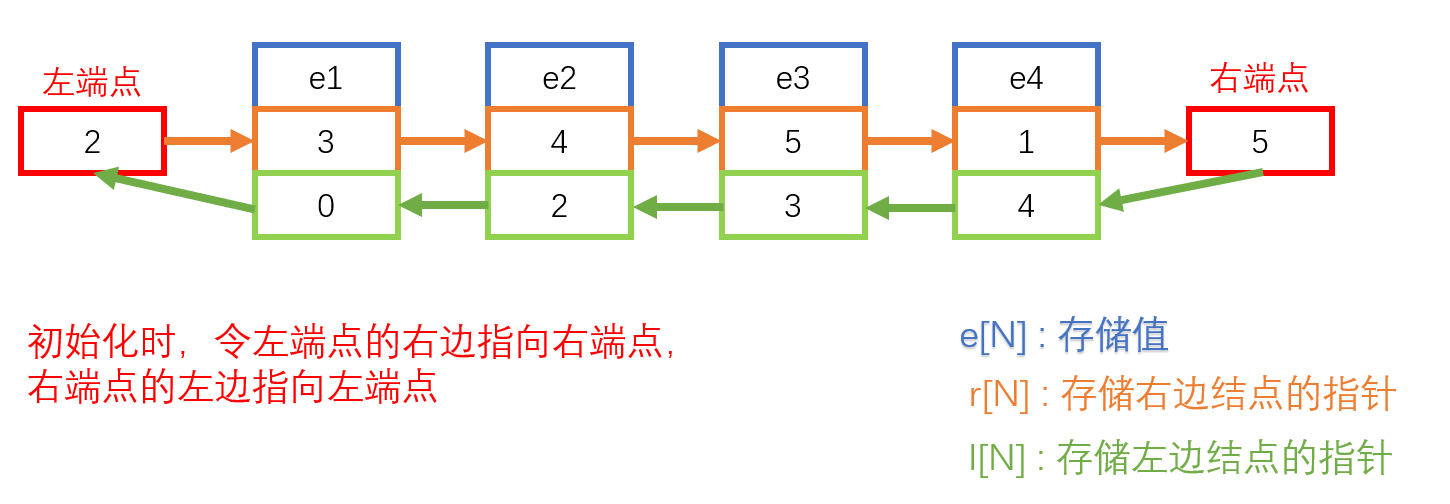 - 在单链表的基础上,取消头结点,换为左端点和右端点,每个结点的指针域存储其左边结点的指针和右边结点的指针