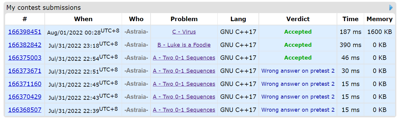 - $A$题一开始没找到规律,找到规律后居然没有把错思路的代码删掉,狠狠的吃