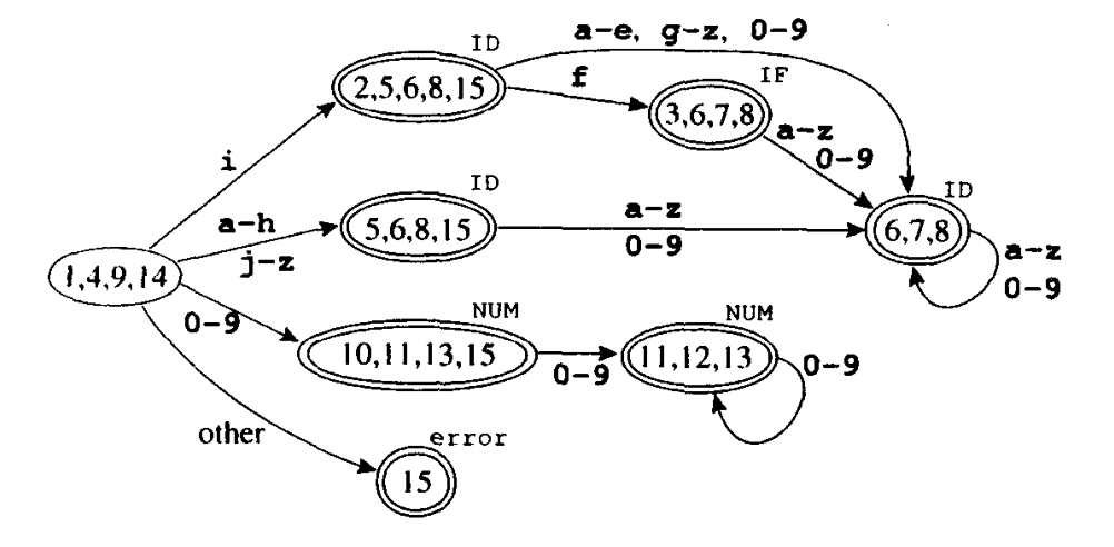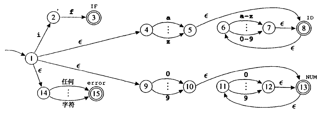 将正则表达式转换至 NFA ,我们利用单词 IF、ID、NUM 以及 error 的一些表达式来举例说明这种转换算法。每个表达式都转换成了一个 NFA,每个 NFA 的头是用不同单词类型标记的终态结点,并且每一个表达式的尾汇合成一个新的初始结点。由此得到的结果(在合并了某些等价的 NFA 状态之后)如下图所示: