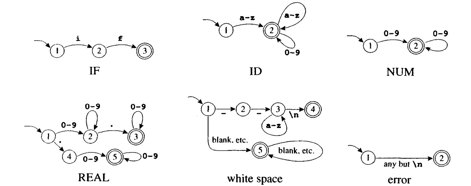 - 最长匹配:初始输入子串中,取可与任何正则表达式匹配的那个最长的字符串作为下一个单词。