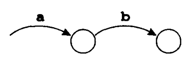 由 $a$ 和 $b$ 经联结运算而形成的正则表达式 $ab$ 对应的 NFA 是由两个 NFA 组合而成的,即将 $a$ 的头与 $b$ 的尾连接起来。由此得到的自动机有一个用 $a$ 标记的尾和一个从 $b$ 边进入的头。