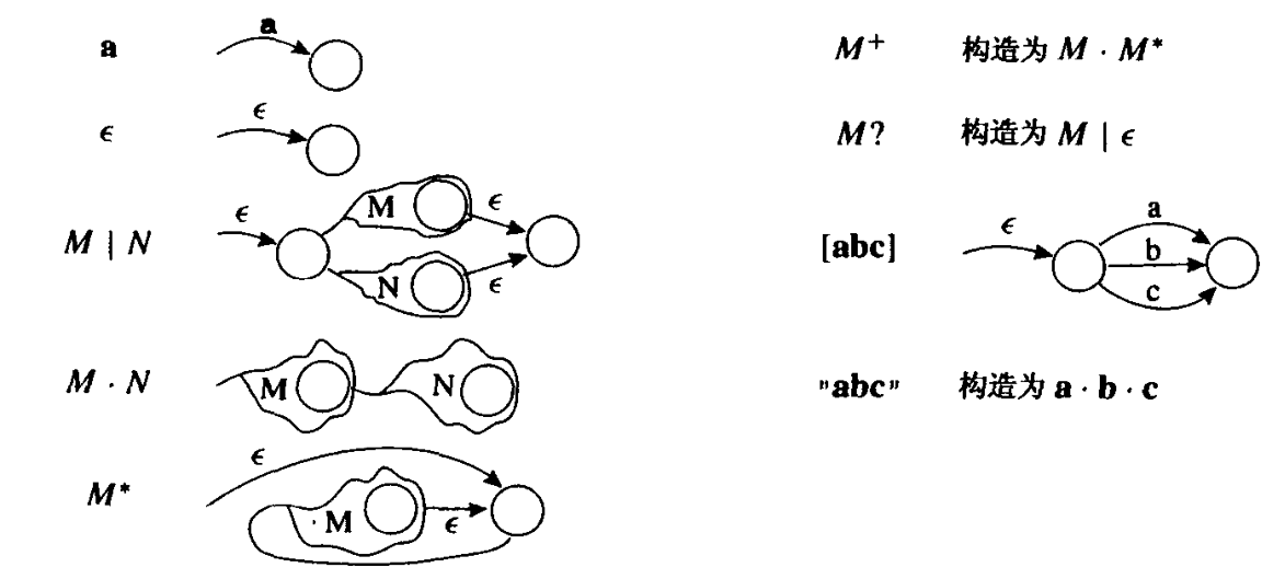 我们可以归纳地定义正则表达式到 NFA 的转换。一个正则表达式或者是原语(单个符号或 $\epsilon$),或者是由多个较小的表达式组合而成。类似地,NFA 或者是基本元素,或者是由多个较小的NFA组合而成。