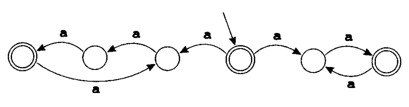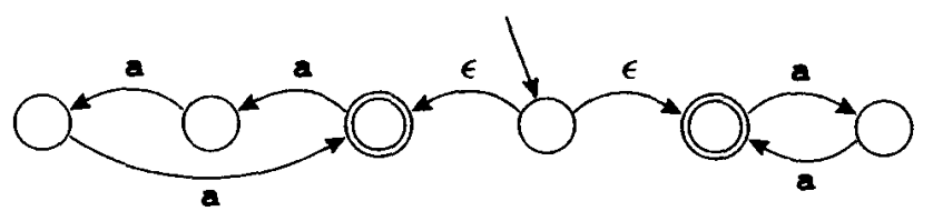 如上图,在初态时,根据输入的字母,自动机既可向左转换,也可向右转换。若选择了向左转换,则接收的是长度为 3 的倍数的字符串;若选择了向右转换,则接收的是长度为偶数的字符串。因此, 由这个 NFA 识别的语言是长度为 2 的倍数或 3 的倍数的所有由字母 a 组成的字符串的集合。