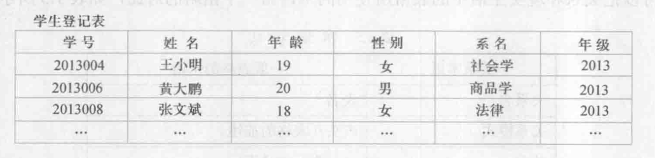 - 例如:上面的关系可描述为学生(学号,姓名,年龄,性别,系名,年级)。