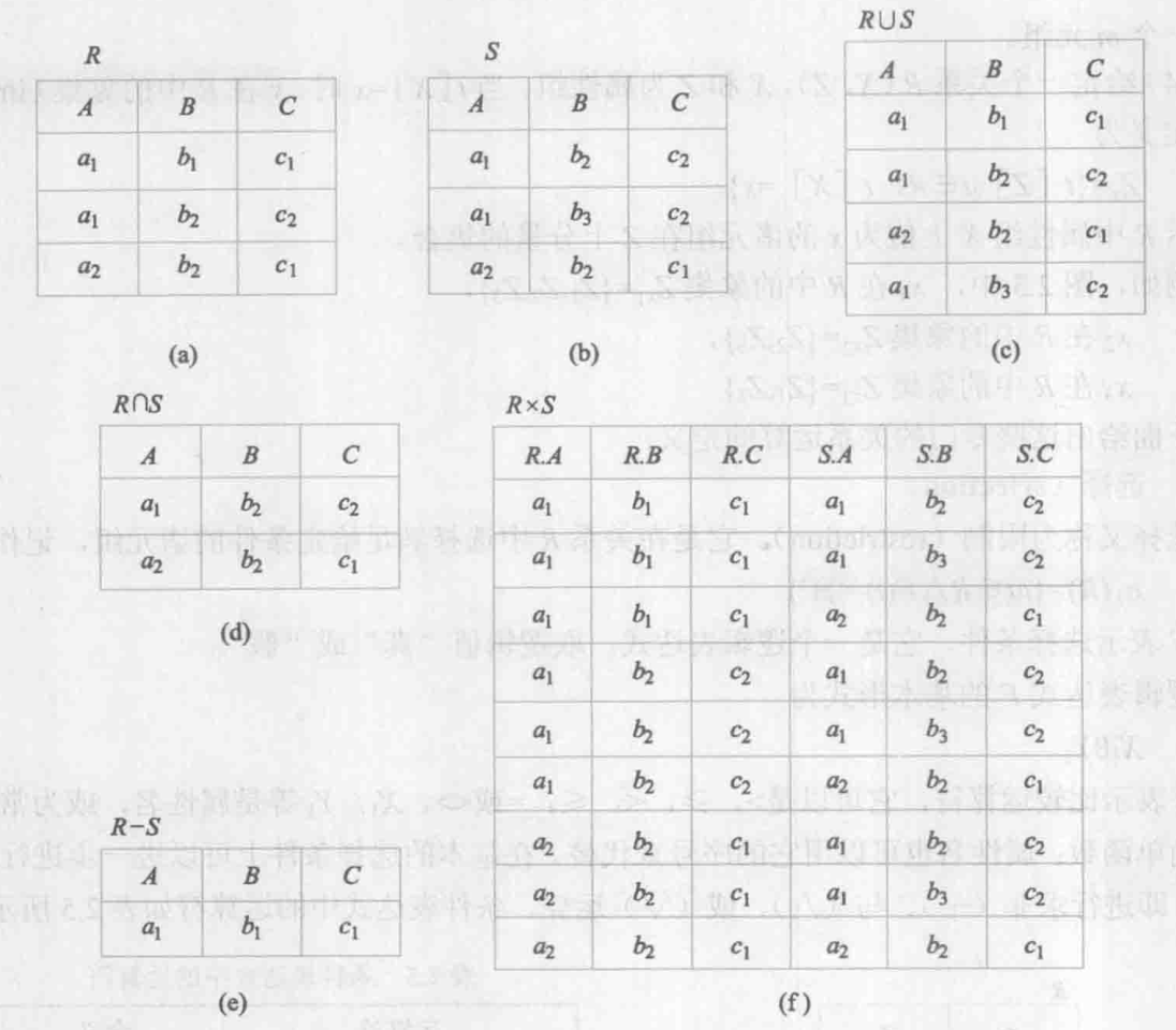 - 关系 $R$ 与关系 $S$ 的交记作 \[R \cap S = \{ t | t \in R \land t \in S \}\]