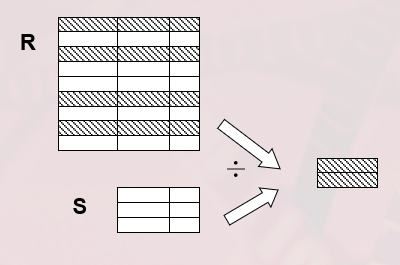 - \[R \div S = \{ t_r[X] | t_r \in R \land \Pi_Y(S) \subseteq Y_x \}\]